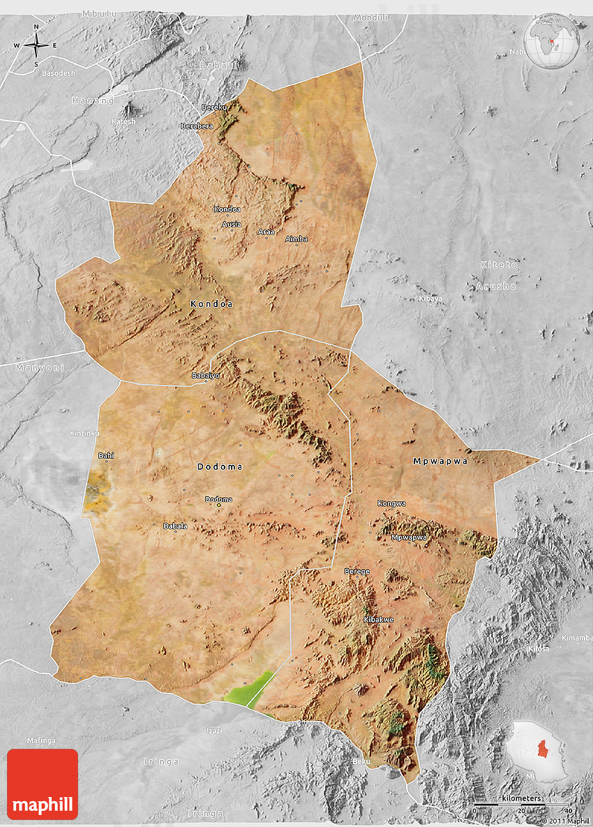 Satellite map shows the Earth's surface as it really looks like. The above map is based on satellite images taken on July 2004. This satellite map of Dodoma is meant for illustration purposes only. For more detailed maps based on newer satellite and aerial images switch to a detailed map view.