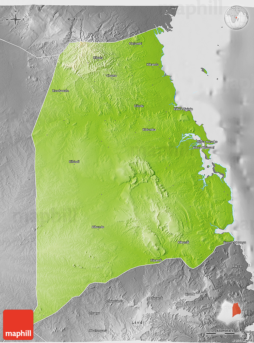 Physical map illustrates the mountains, lowlands, oceans, lakes and rivers and other physical landscape features of Kilwa. Differences in land elevations relative to the sea level are represented by color.