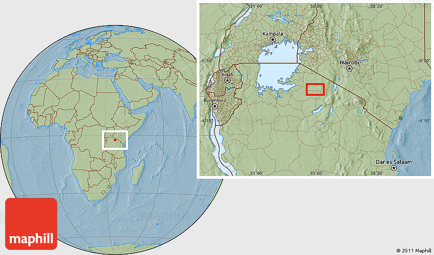 Maphill is a collection of map images. This image combines a savanna style map with the globe centered on Nyabwitagi. Use the buttons under the image to switch to different map types.