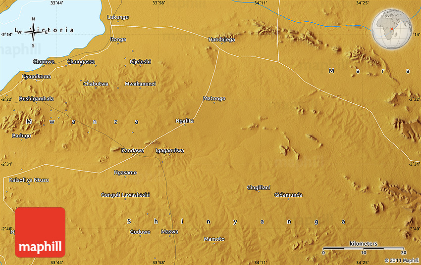 Physical map illustrates the mountains, lowlands, oceans, lakes and rivers and other physical landscape features of Mwakanunzi. Differences in land elevations relative to the sea level are represented by color.