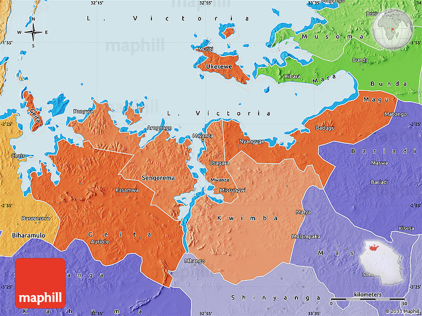Each map type offers different information and each map style is designed for a different purpose. Read about the styles and map projection used in the above map (Political Shades Map of Mwanza).