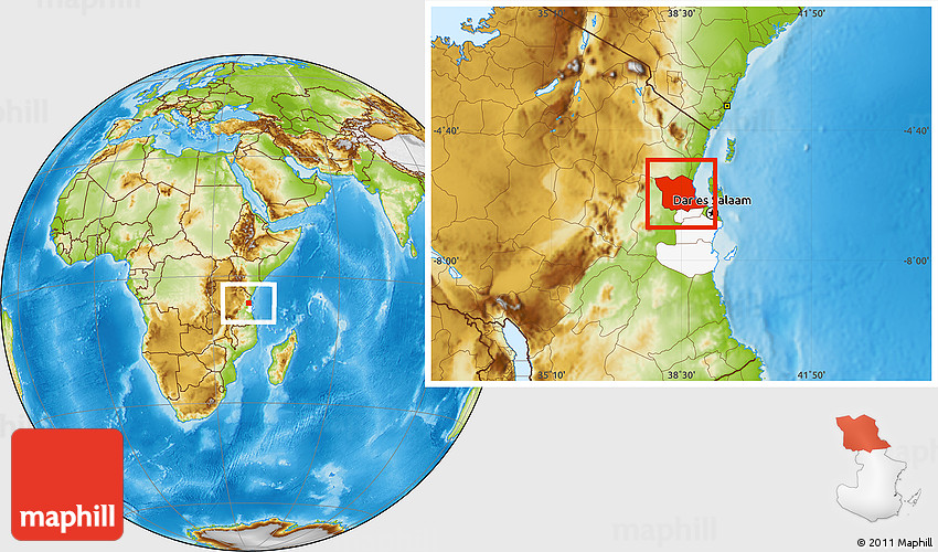 Maphill is a collection of map images. This image combines a physical map with the globe centered on Bagamoyo. Use the buttons under the image to switch to different map types.