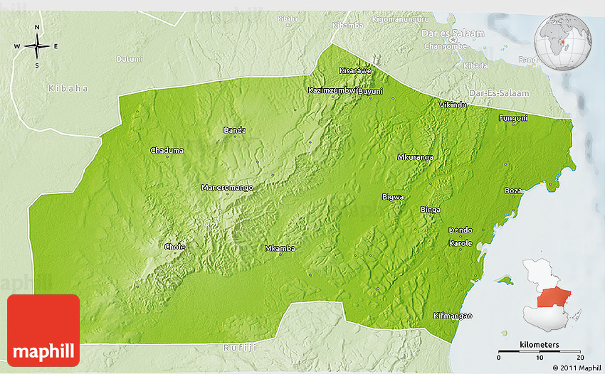Physical map illustrates the mountains, lowlands, oceans, lakes and rivers and other physical landscape features of Kisarawe. Differences in land elevations relative to the sea level are represented by color.
