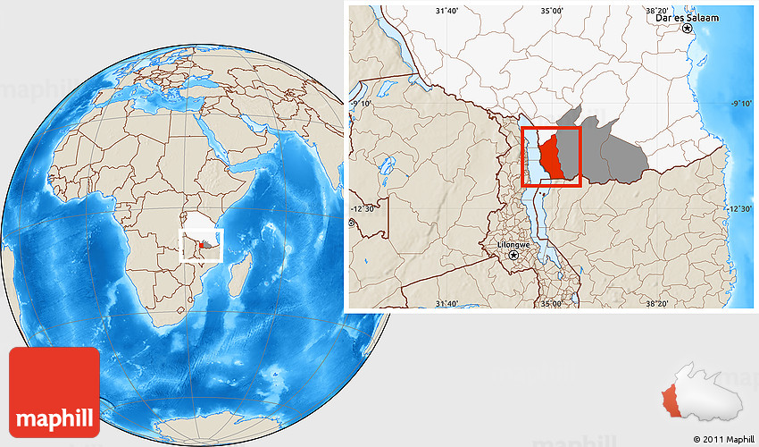 Maphill is a collection of map images. This image combines a shaded relief map with the globe centered on Mbinga. Use the buttons under the image to switch to different map types.