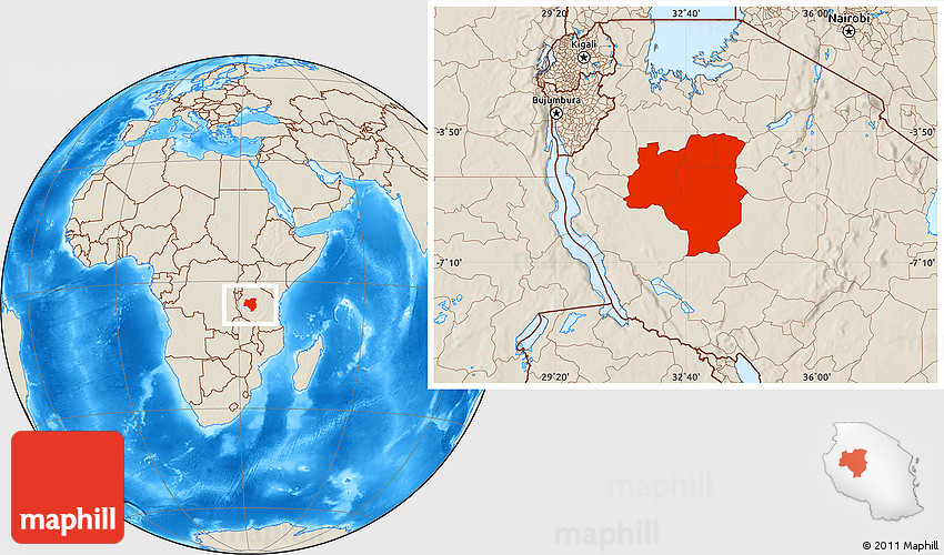 Maphill is a collection of map images. This image combines a shaded relief map with the globe centered on Tabora. Use the buttons under the image to switch to different map types.