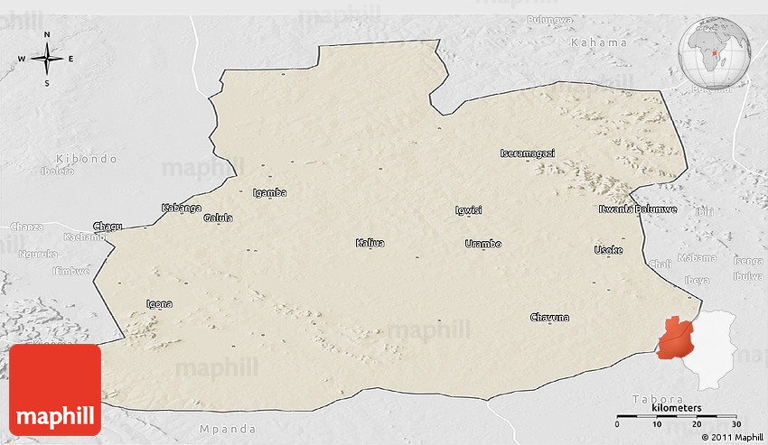 Shaded relief map shows landscape features, such as mountains, valleys and plateaus. Flat areas are smooth on the map, areas with steep slopes and mountains appear more rough. The above map of Urambo was created using a digital elevation model.