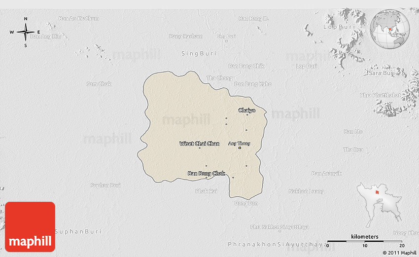 Maphill is a collection of map images. This view of Ang Thong at an angle of 60° is one of these images. Click on the Detailed button under the map for a more comprehensive map.