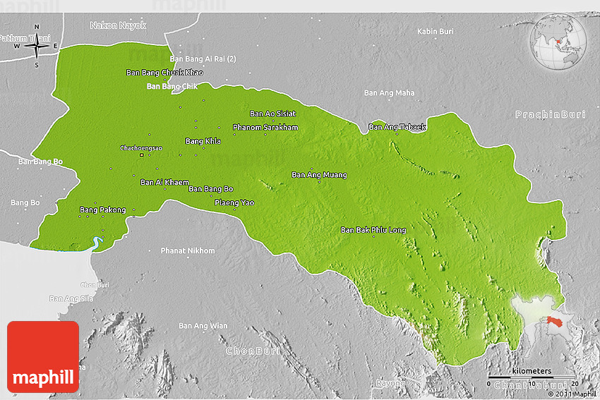 Physical map illustrates the mountains, lowlands, oceans, lakes and rivers and other physical landscape features of Chachoengsao. Differences in land elevations relative to the sea level are represented by color.
