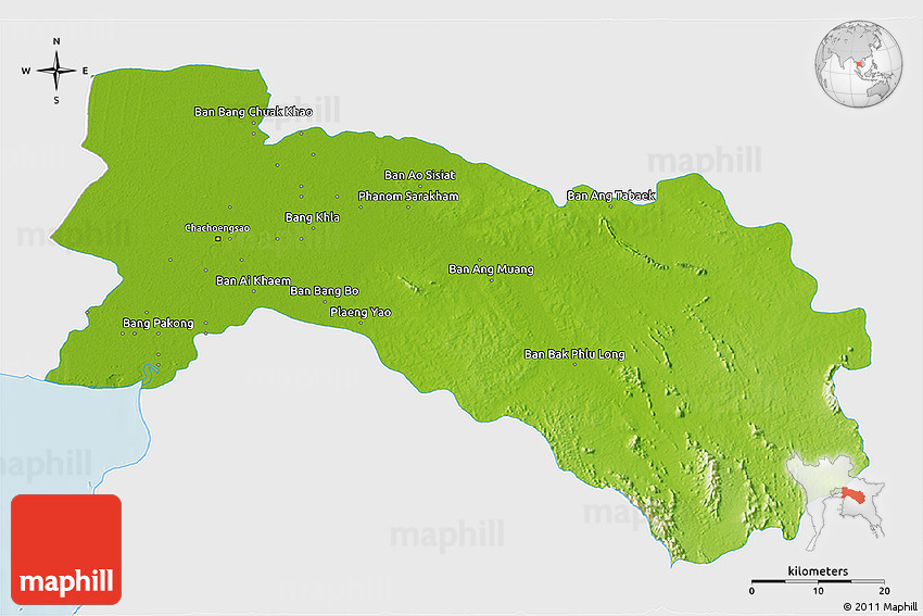 Physical map illustrates the mountains, lowlands, oceans, lakes and rivers and other physical landscape features of Chachoengsao. Differences in land elevations relative to the sea level are represented by color.