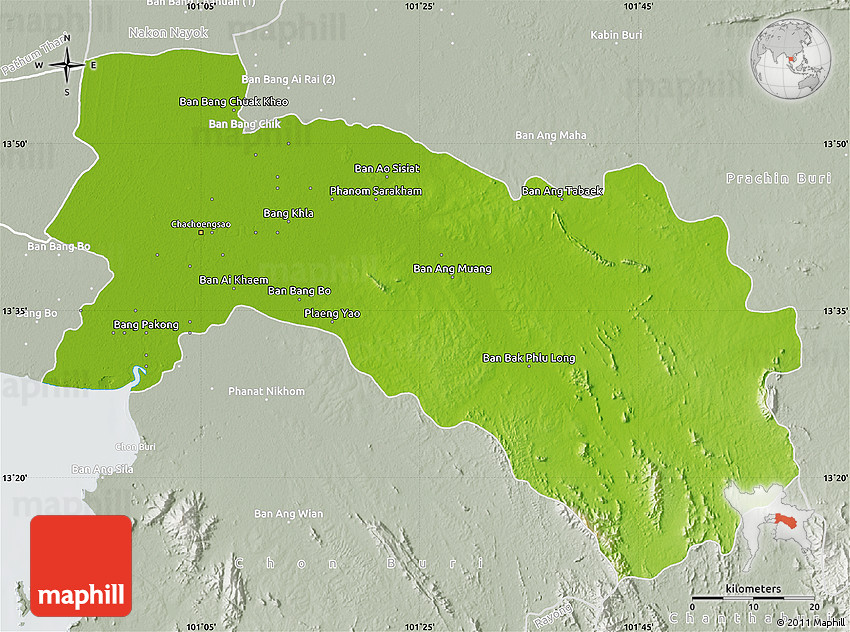 Physical map illustrates the mountains, lowlands, oceans, lakes and rivers and other physical landscape features of Chachoengsao. Differences in land elevations relative to the sea level are represented by color.