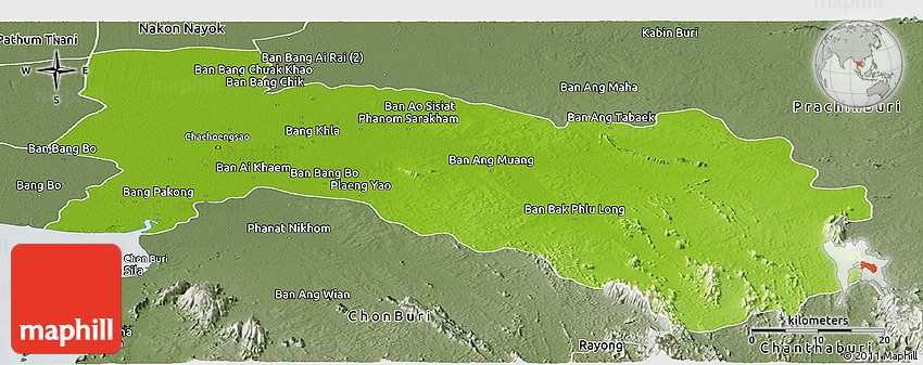 Physical map illustrates the mountains, lowlands, oceans, lakes and rivers and other physical landscape features of Chachoengsao. Differences in land elevations relative to the sea level are represented by color.