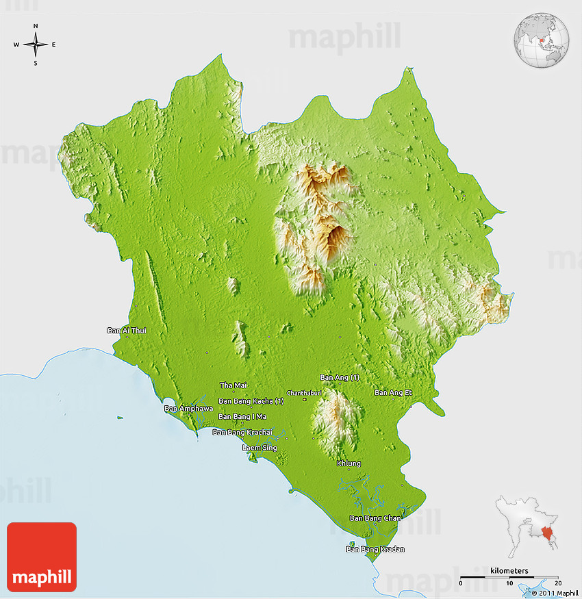 Physical map illustrates the mountains, lowlands, oceans, lakes and rivers and other physical landscape features of Chanthaburi. Differences in land elevations relative to the sea level are represented by color.