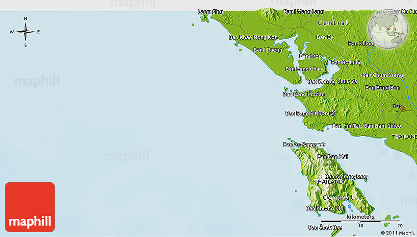 Physical map illustrates the mountains, lowlands, oceans, lakes and rivers and other physical landscape features of Ban Chum Saeng. Differences in land elevations relative to the sea level are represented by color.
