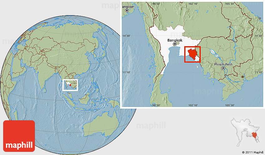 The savanna style location map represents one of several map types and styles available. Look at Chanthaburi, Central, Thailand from different perspectives.