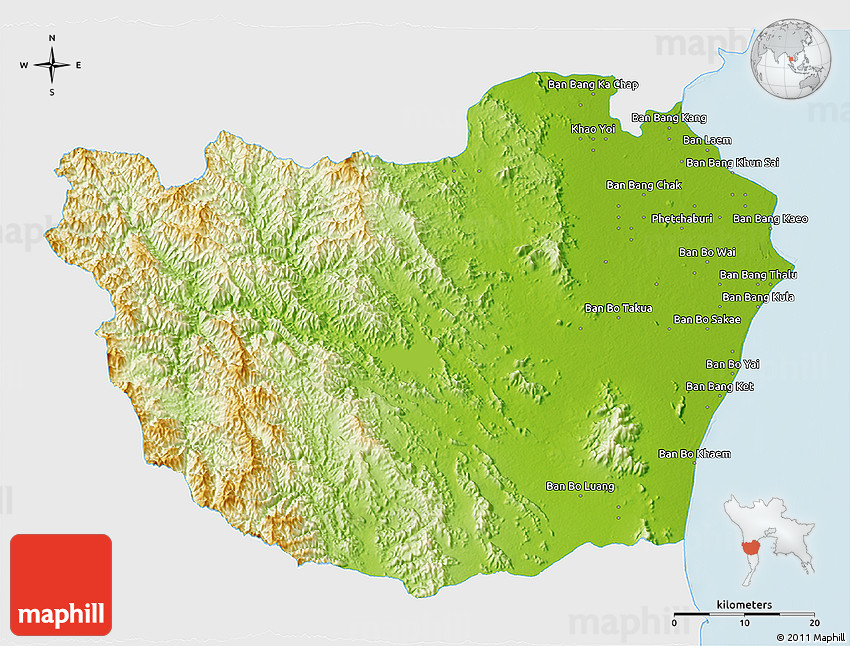 Physical map illustrates the mountains, lowlands, oceans, lakes and rivers and other physical landscape features of Phetcha Buri. Differences in land elevations relative to the sea level are represented by color.