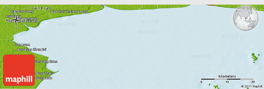 The panoramic physical map represents one of many map types and styles available. Look at Ban Tanot Lai, Phetcha Buri, Central, Thailand from different perspectives.