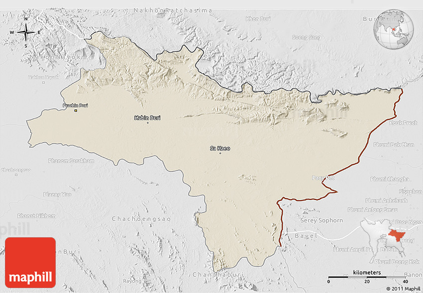 Shaded relief map shows landscape features, such as mountains, valleys and plateaus. Flat areas are smooth on the map, areas with steep slopes and mountains appear more rough. The above map of Prachin Buri was created using a digital elevation model.