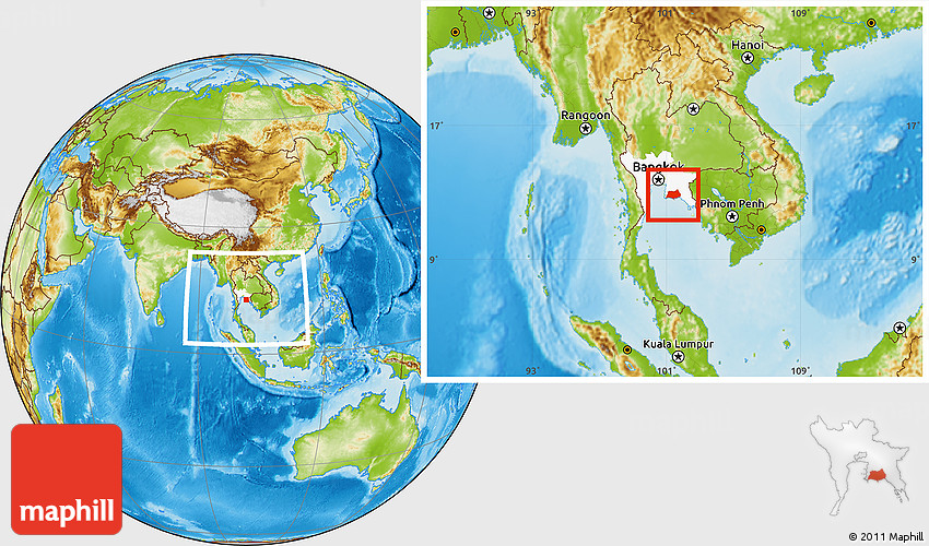 Maphill is a collection of map images. This image combines a physical map with the globe centered on Rayong. Use the buttons under the image to switch to different map types.