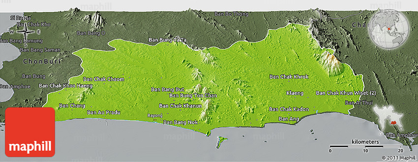 Physical map illustrates the mountains, lowlands, oceans, lakes and rivers and other physical landscape features of Rayong. Differences in land elevations relative to the sea level are represented by color.