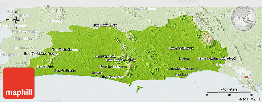 Physical map illustrates the mountains, lowlands, oceans, lakes and rivers and other physical landscape features of Rayong. Differences in land elevations relative to the sea level are represented by color.