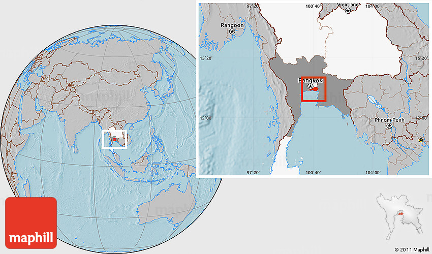 Maphill is a collection of map images. This image combines a gray map with the globe centered on Samut Prakan. Use the buttons under the image to switch to different map types.