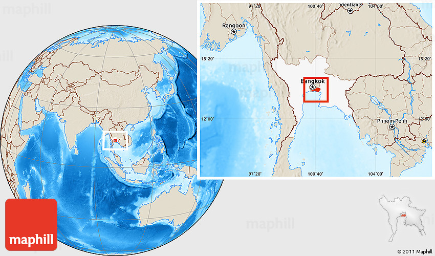 Maphill is a collection of map images. This image combines a shaded relief map with the globe centered on Samut Prakan. Use the buttons under the image to switch to different map types.