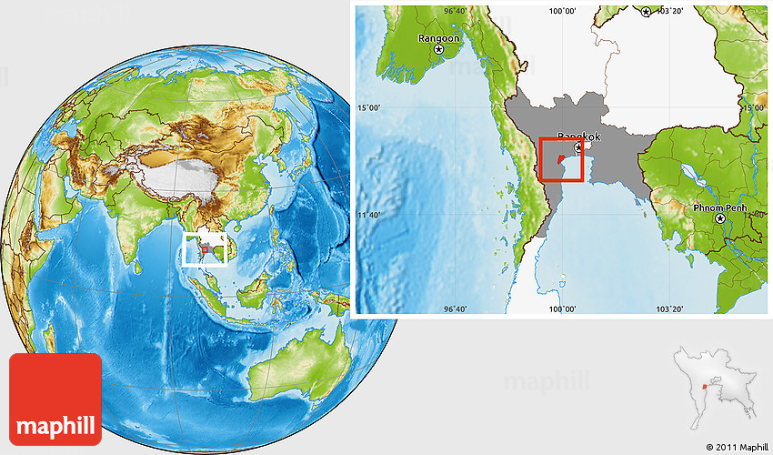 Maphill is a collection of map images. This image combines a physical map with the globe centered on Samut Songkhram. Use the buttons under the image to switch to different map types.