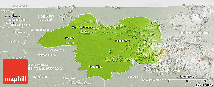 The panoramic physical map represents one of several map types and styles available. Look at Sara Buri, Central, Thailand from different perspectives.