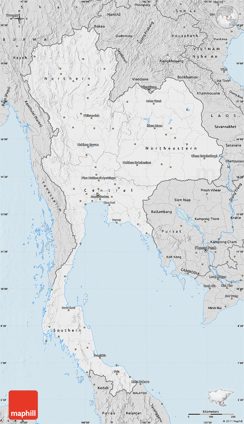 Maphill is a collection of map images. This silver style map of Thailand is one of them. Click on the Detailed button under the image to switch to a more detailed map.