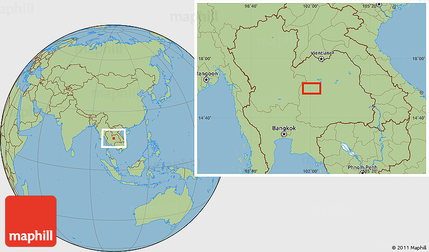 The location map of Ban Meng combines two projections: the orthographic azimuthal projection for the globe and the simple geographic projection for the rectangular part of the map. Geographic projection has straight meridians and parallels, each degree of latitude and longitude is the same size over the entire world map.