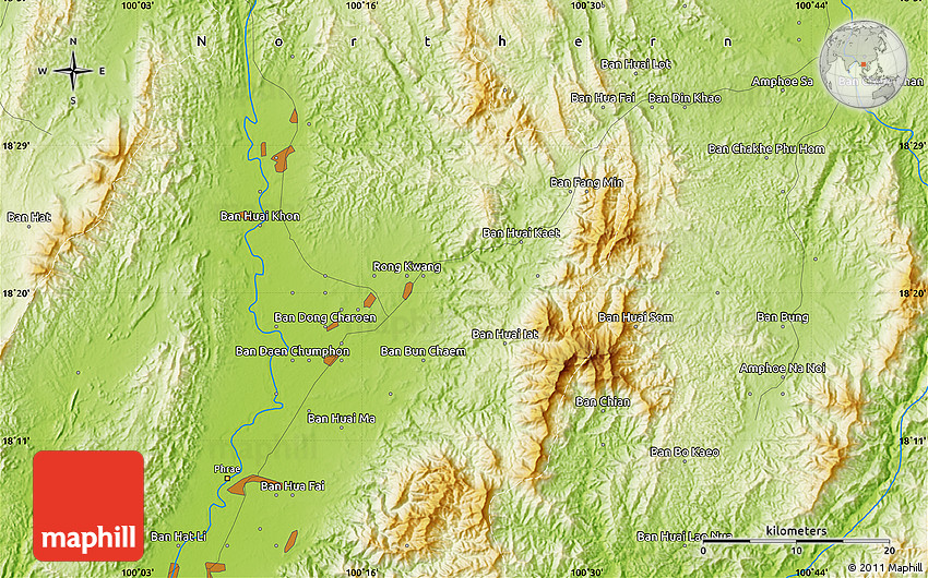 Each map type offers different information and each map style is designed for a different purpose. Read about the styles and map projection used in the above map (Physical Map of Ban Rang Mon).