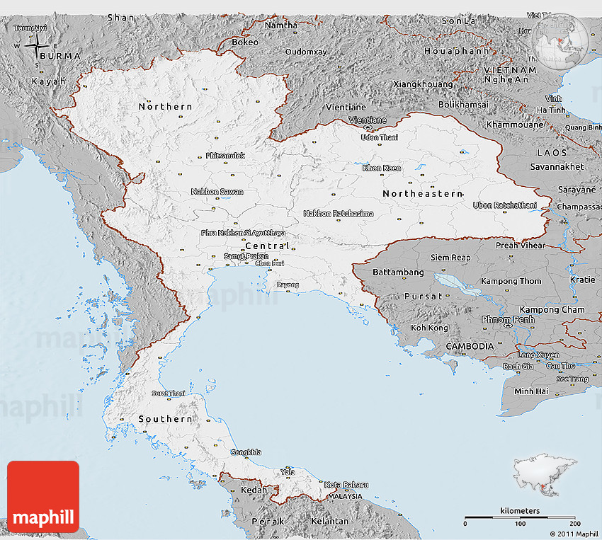 The panoramic gray map represents one of many map types and styles available. Look at Thailand from different perspectives.