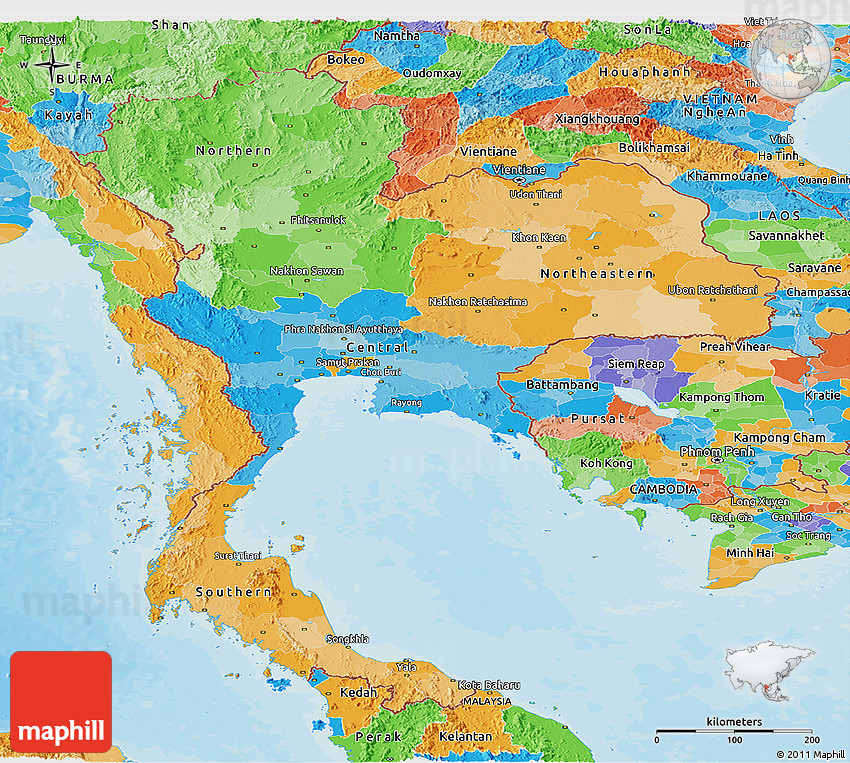 The panoramic political map represents one of many map types and styles available. Look at Thailand from different perspectives.