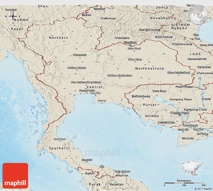 The value of Maphill lies in the possibility to look at the same area from several perspectives. Maphill presents the map of Thailand in a wide variety of map types and styles.