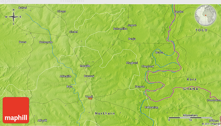 The 3D physical map represents one of many map types and styles available. Look at Liagalbou, Bassar, Kara, Togo from different perspectives.