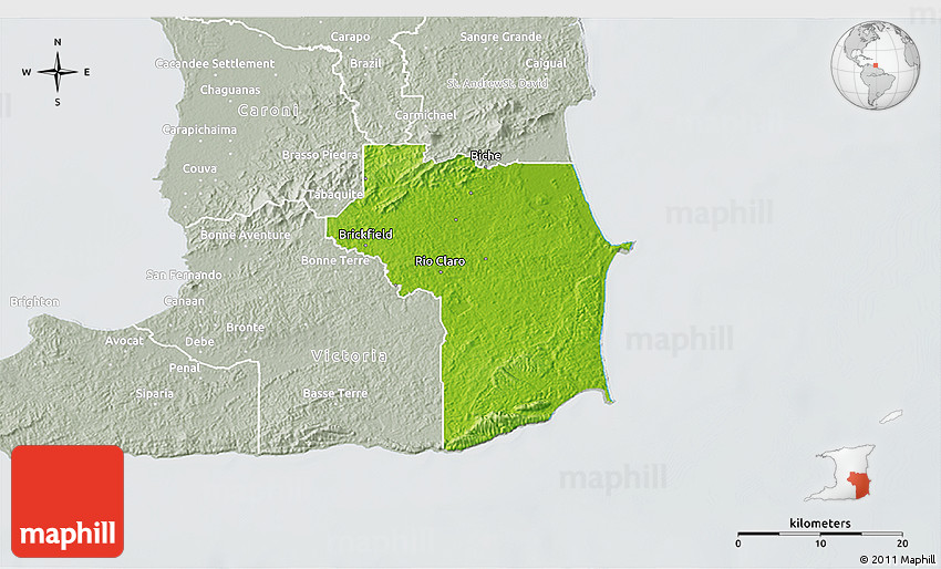 Physical map illustrates the mountains, lowlands, oceans, lakes and rivers and other physical landscape features of Nariva/Mayaro. Differences in land elevations relative to the sea level are represented by color.