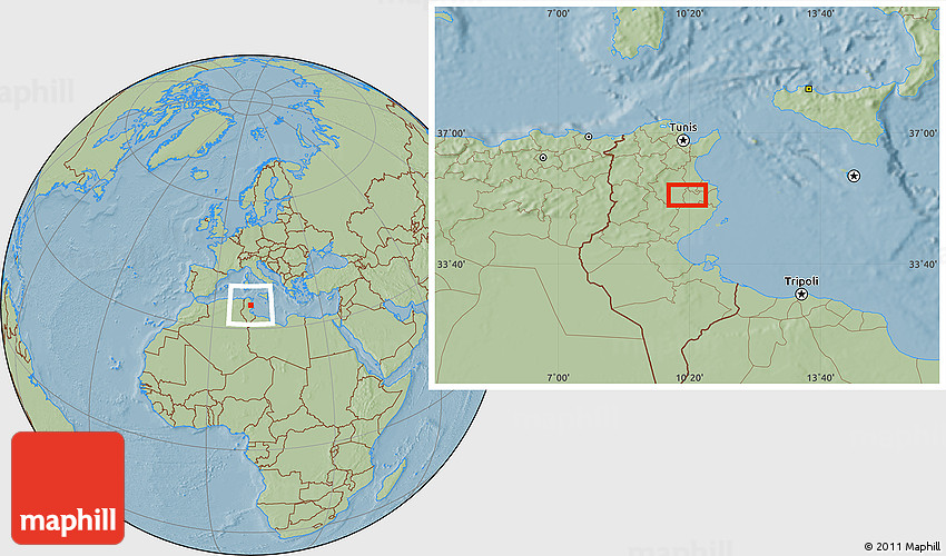 The location map of Feddane el Begar combines two projections: the orthographic azimuthal projection for the globe and the simple geographic projection for the rectangular part of the map. Geographic projection has straight meridians and parallels, each degree of latitude and longitude is the same size over the entire world map.