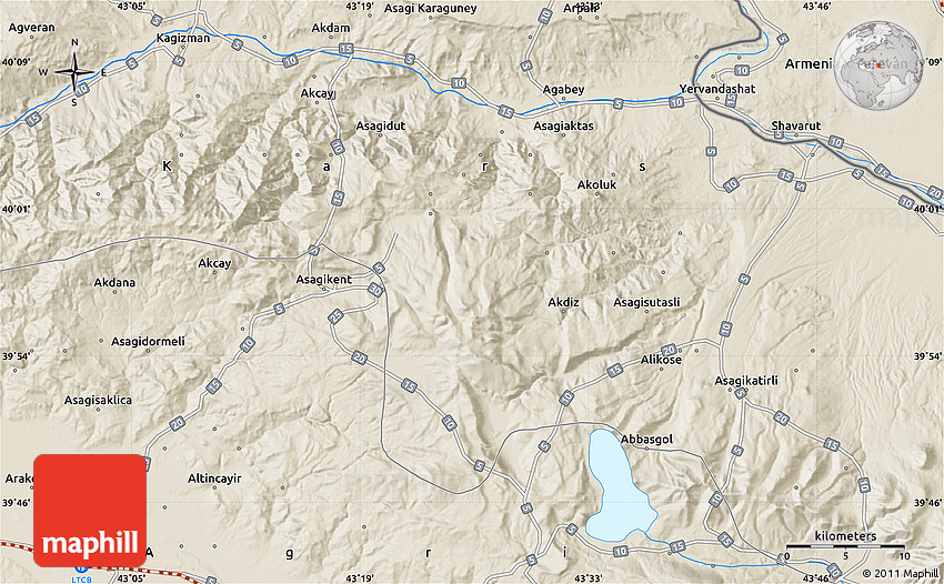 The flat shaded relief map represents one of many map types available. Look at Yukarıdürmeli, Agri, Turkey from different perspectives.