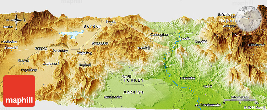 The panoramic physical map represents one of many map types and styles available. Look at Aşağıoba, Antalya, Turkey from different perspectives.