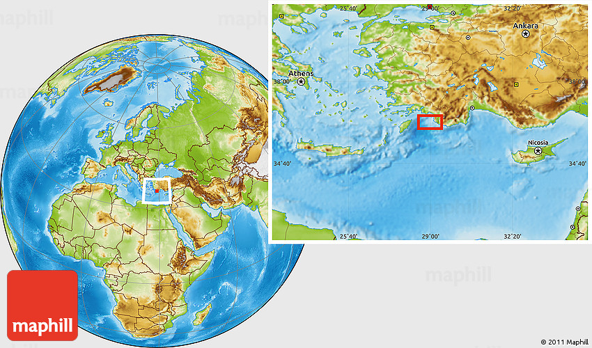 Maphill is a collection of map images. This image combines a physical map with the globe centered on Gelemiş. Use the buttons under the image to switch to different map types.