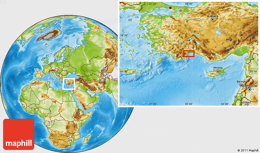 Maphill is a collection of map images. This image combines a physical map with the globe centered on Sütçüler. Use the buttons under the image to switch to different map types.