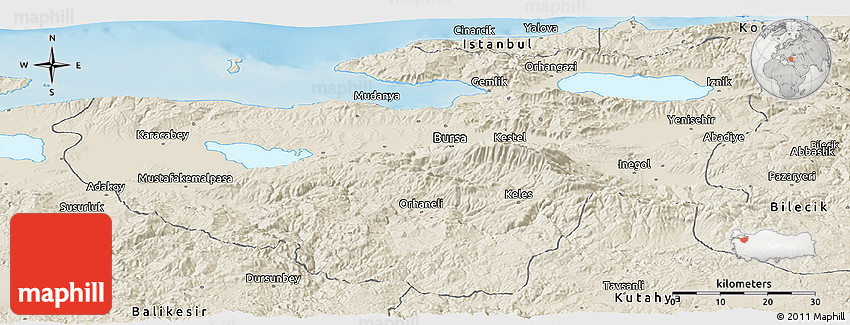 Shaded relief map shows landscape features, such as mountains, valleys and plateaus. Flat areas are smooth on the map, areas with steep slopes and mountains appear more rough. The above map of Bursa was created using a digital elevation model.