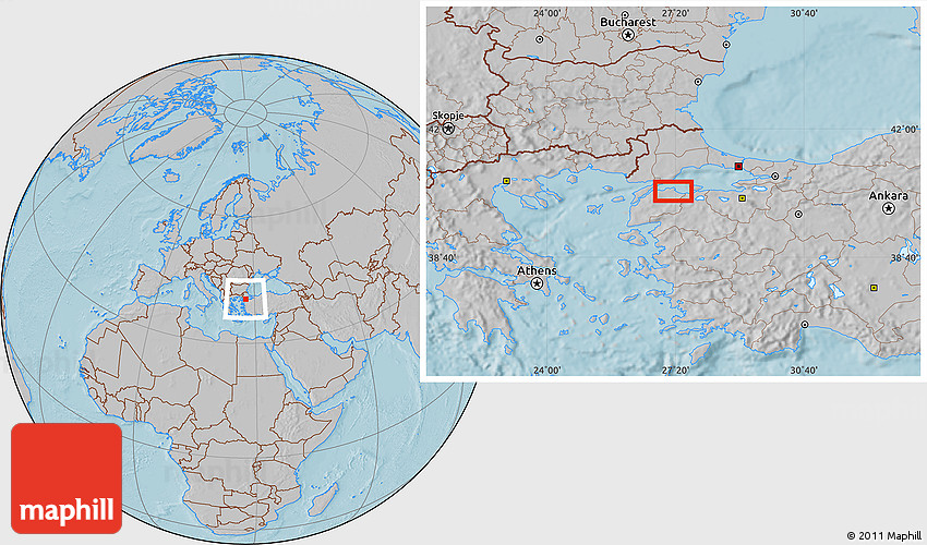Maphill is a collection of map images. This image combines a gray map with the globe centered on Hacıpehlivan. Use the buttons under the image to switch to different map types.