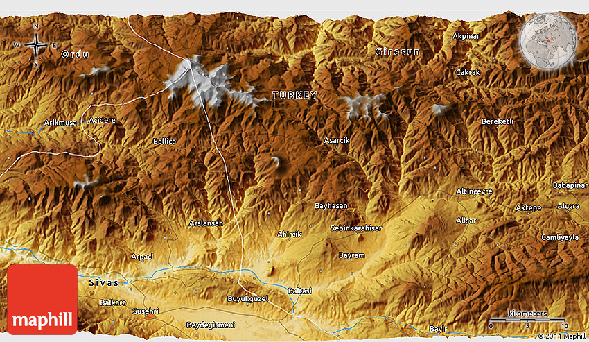 The 3D physical map represents one of many map types and styles available. Look at Yedikardeş, Giresun, Turkey from different perspectives.