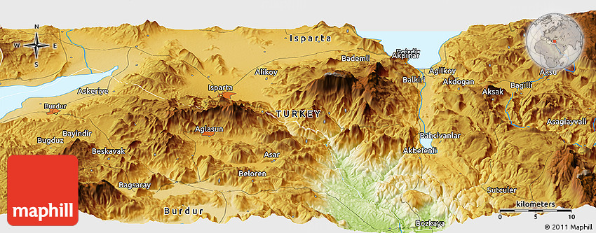 The panoramic physical map represents one of many map types and styles available. Look at Kayıköy, Isparta, Turkey from different perspectives.