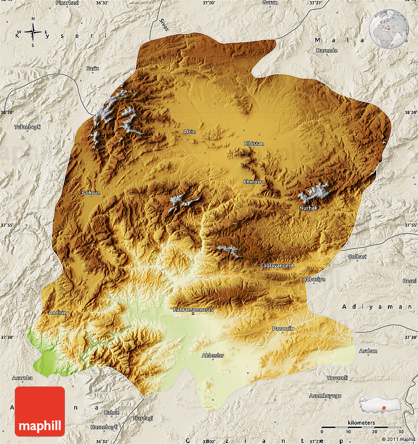 Physical map illustrates the mountains, lowlands, oceans, lakes and rivers and other physical landscape features of K. Maras. Differences in land elevations relative to the sea level are represented by color.