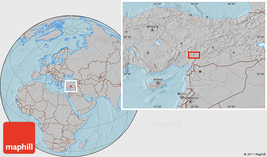 Maphill is a collection of map images. This image combines a gray map with the globe centered on Yusufhacılı. Use the buttons under the image to switch to different map types.
