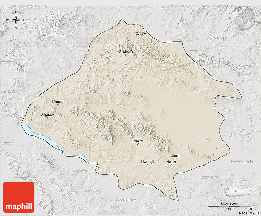 Shaded relief map shows landscape features, such as mountains, valleys and plateaus. Flat areas are smooth on the map, areas with steep slopes and mountains appear more rough. The above map of Kirsehir was created using a digital elevation model.