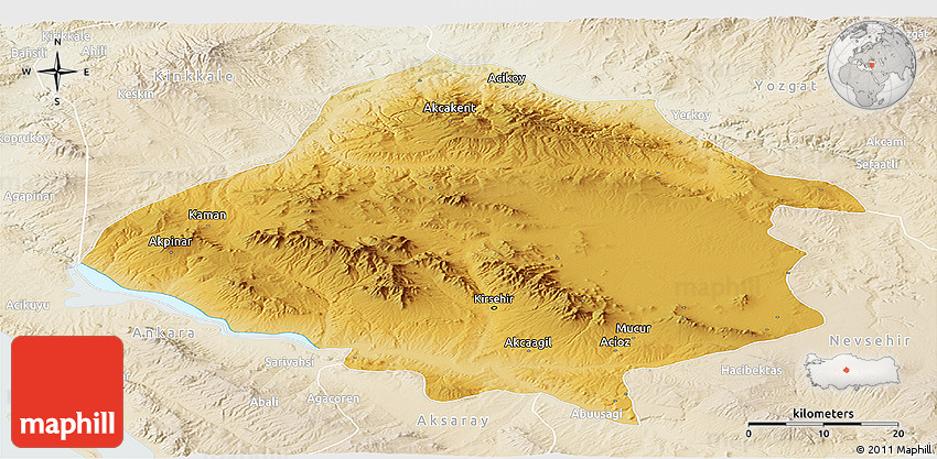 The panoramic physical map represents one of many map types and styles available. Look at Kirsehir from different perspectives.