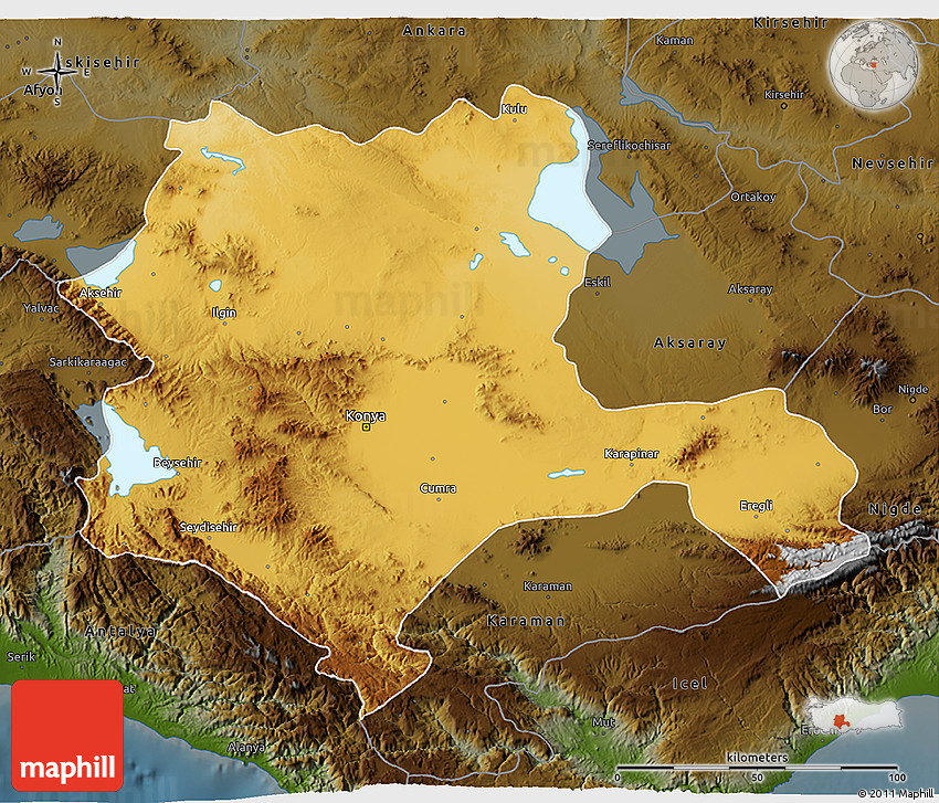 The 3D physical map represents one of many map types and styles available. Look at Konya from different perspectives.